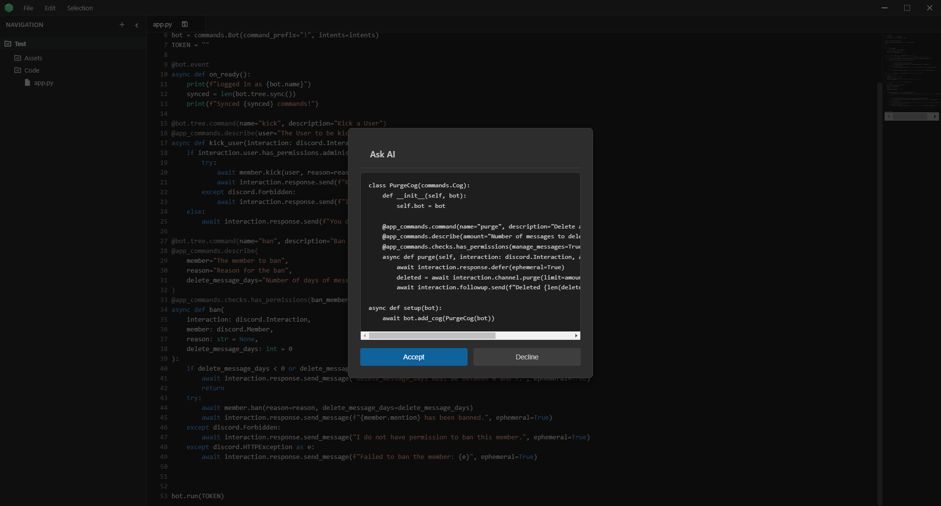 You can access your personal assistant using the Ctrl + T shortcut while your cursor is active in the editor component. You can then ask it to generate a snippet of code, or even a full program, within seconds. Completely free, no jargon.